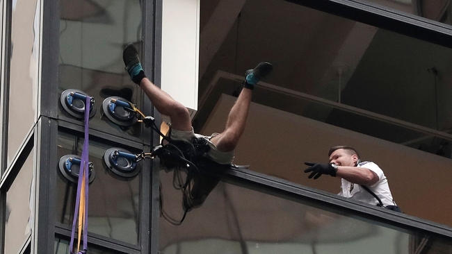 The chase ended dramatically just after 6:30 p.m. Two officers leaned far out of a window, grabbed the climber's arm and harness, and in a flash yanked him from his dangling stirrups. He went through the opening head first, his legs pointed skyward. "I reached out. I took hold of his hand and I said, 'Sir, would you come with me,'" said detective Christopher Williams, who made the grab.