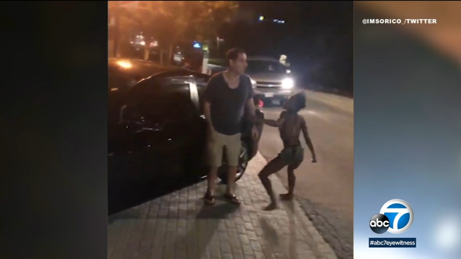 At one point, she opens the door of the Prius and tries to get inside, but the driver grabs her, pulls her out and throws her to the ground.