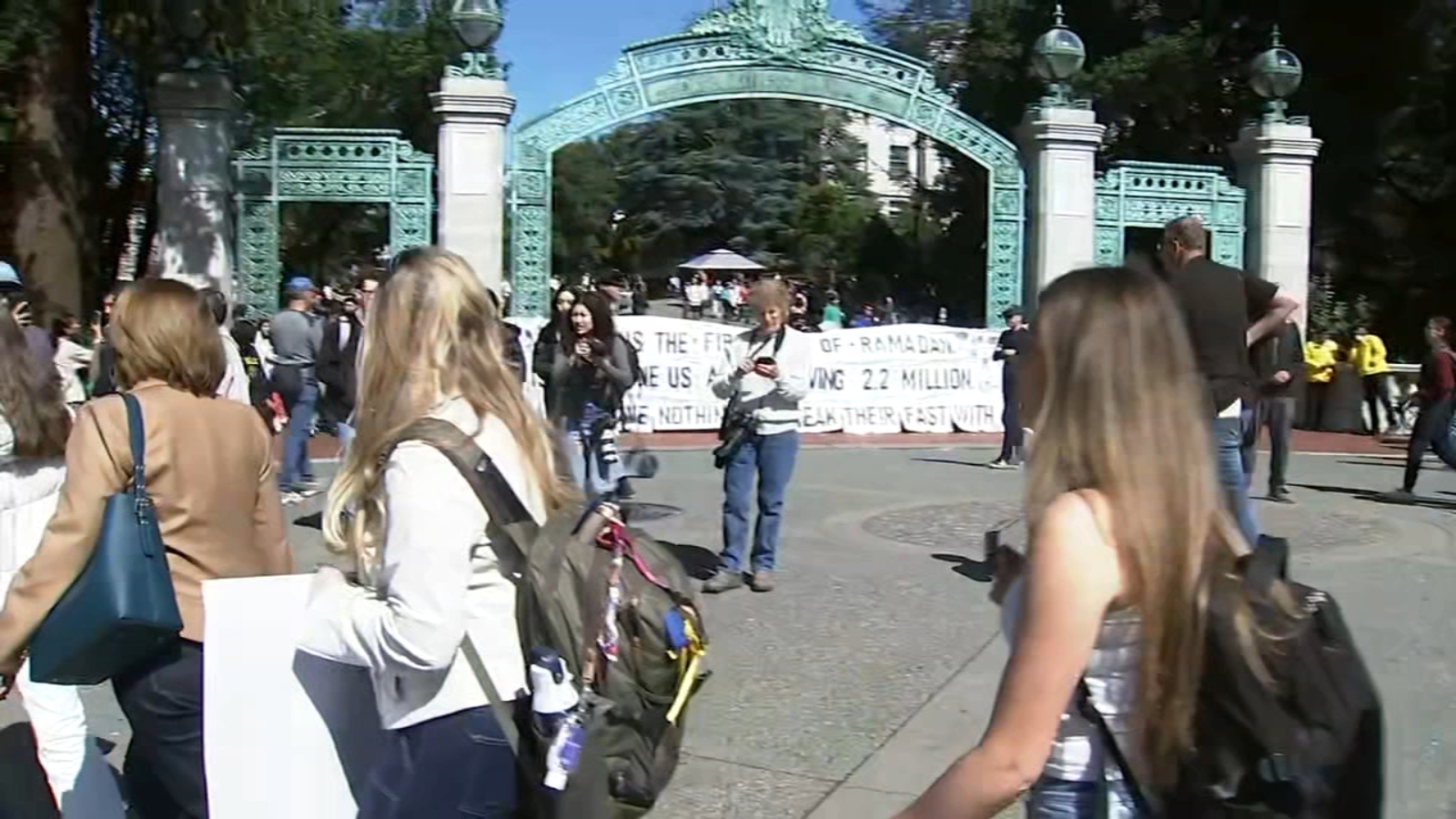 BERKELEY, Calif. (KGO) -- Jewish students at UC Berkeley were able to successfully march and rally on campus Monday just two weeks after violence interrupted a previous gathering. University officials also forced supporters of Palestinian justice to take down tape across Sather Gate.