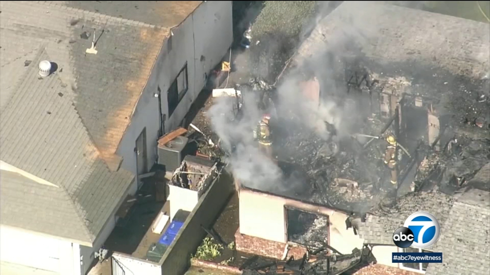 UPLAND, Calif. -- The pilot of a single-engine plane died after crashing into a house in Upland Thursday morning, sparking a massive fire, officials said.