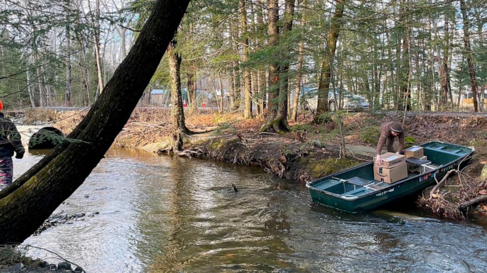 A person spotted Long on the other side of a washed out road using a small boat to cross and deliver multiple packages, Portland, Maine, ABC affiliate WMTW reported.