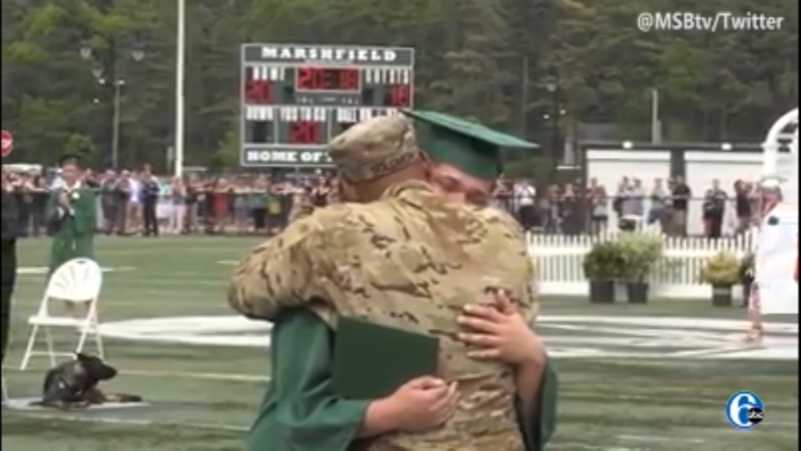 Video posted by Marshfield Student Broadcasting shows the father and son hugging on the field.