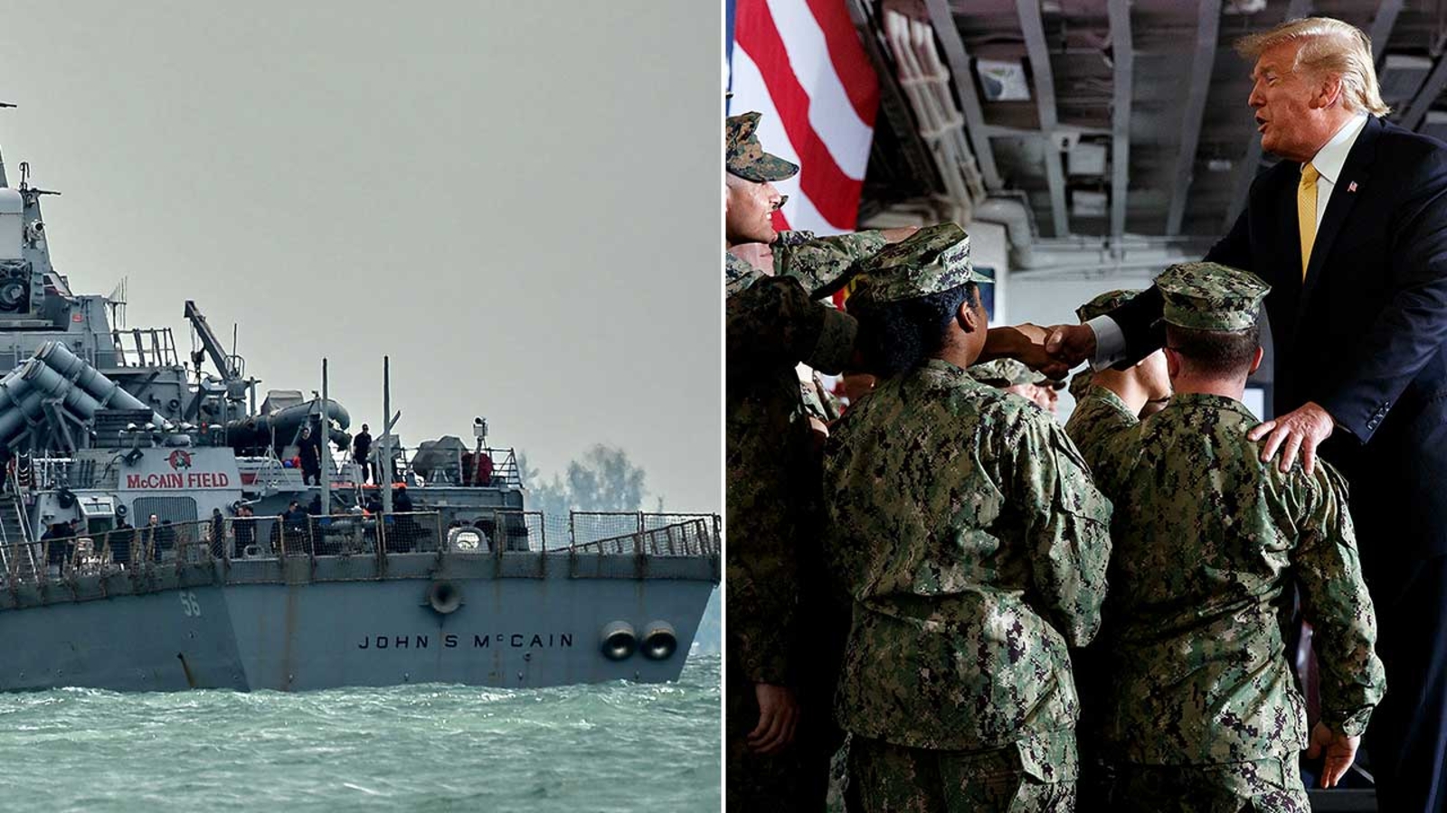 Two U.S. officials told the AP that sailors on the USS John S. McCain were not told to stay away but that many were away for the long weekend. The officials also said that about 800 sailors from more than 20 ships and Navy commands were on the USS Wasp during the president's visit, and all wore the same Navy hat that has no logo, rather than wearing individual ship or command hats.