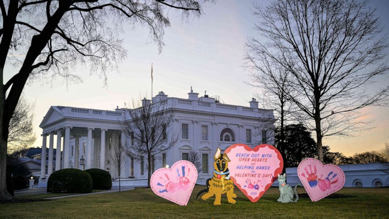 Three large, hand-painted hearts sit on the White House North Lawn, one with a message to "Reach out with Open Hearts and Helping Hands this Valentine's Day," while the two other hearts flanking it feature the children's handprints.