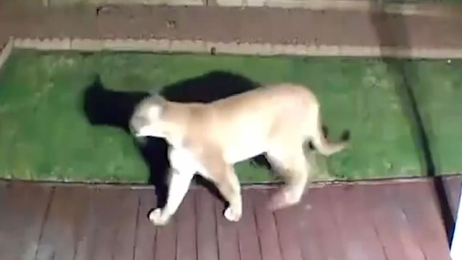 The video shows an apparently healthy adult mountain lion slowly walking through the yard of a home in the middle of the night.