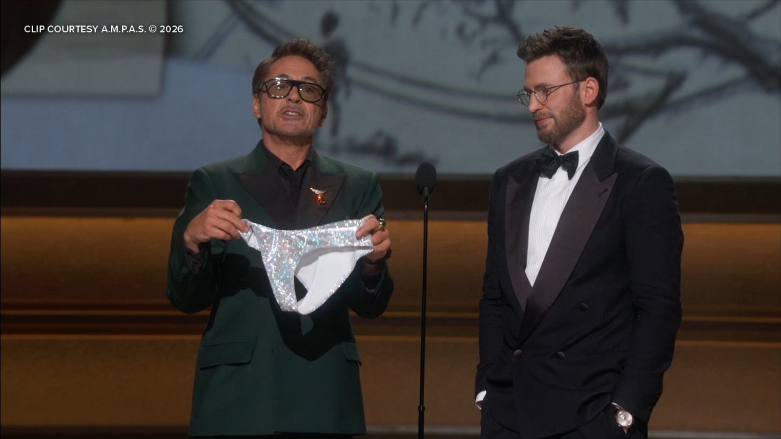 Robert Downey Jr. presents Channing Tatum's thong from 'Magic Mike' to Chris Evans
