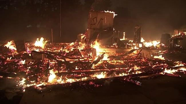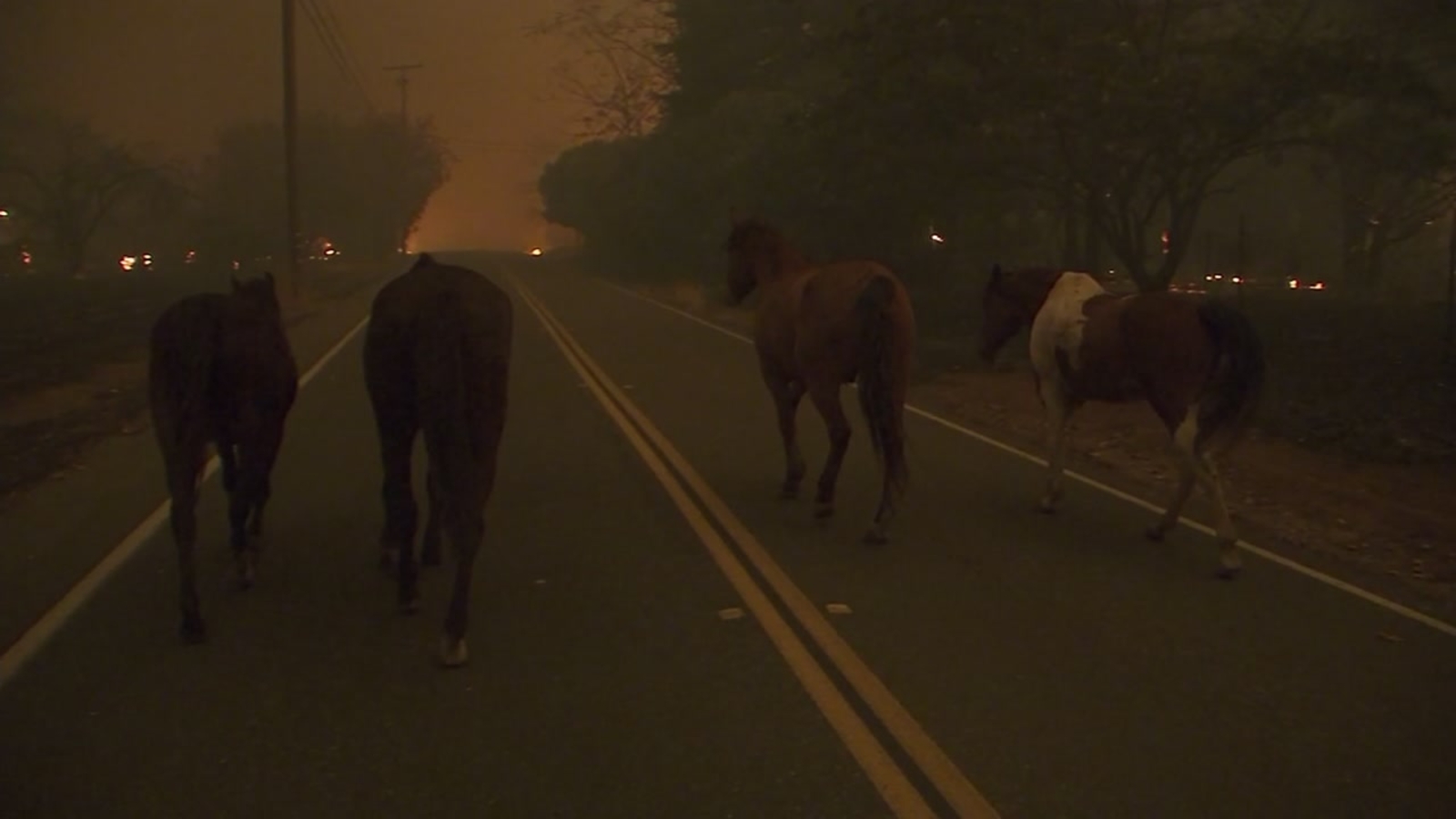 PARADISE, Calif. (KGO) -- It's not just people fleeing the Camp Fire in Butte County. ABC7's Laura Anthony witnesses several horses running together in the town of Paradise as flames grew nearby.