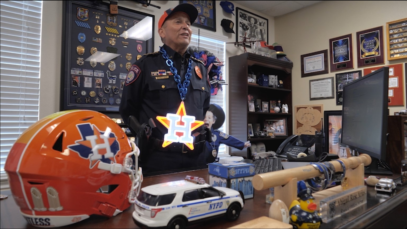 JAMAICA BEACH, Texas -- You don't want to get pulled over by police, but if you do, you will see Jamaica Beach police officers sporting badges and hats with Astros-themed colors.