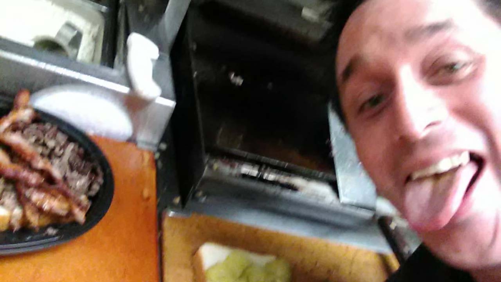 His impromptu adventure behind the counter was captured via selfie photos.