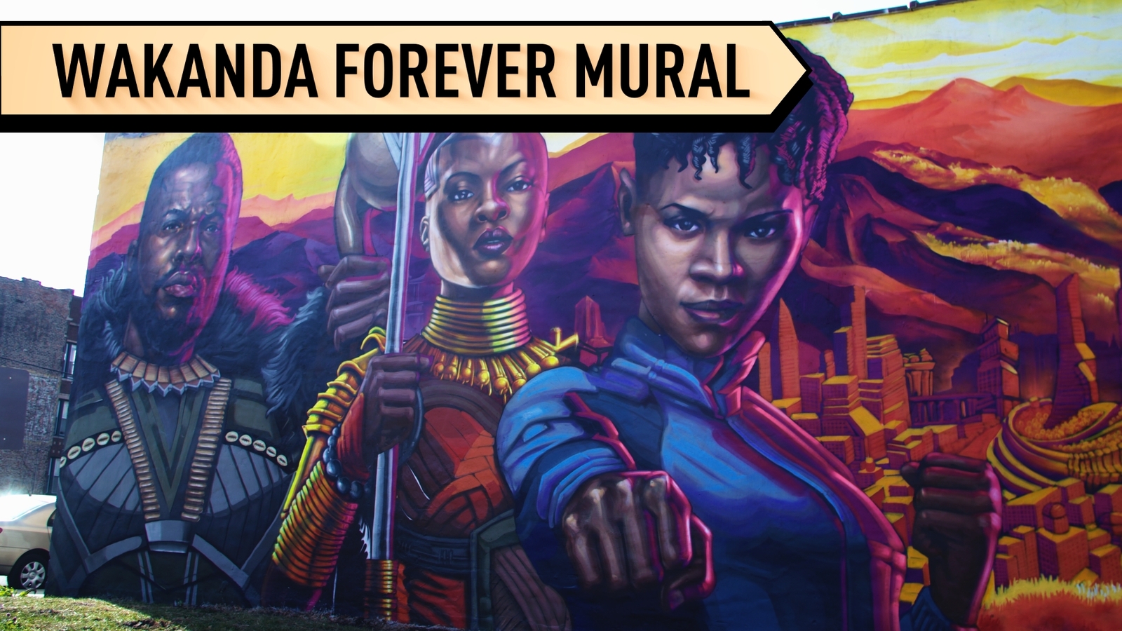 The mural depicts "Wakanda Forever" characters M'Baku, Okoye and Shuri proudly standing among a vibrant Wakanda.