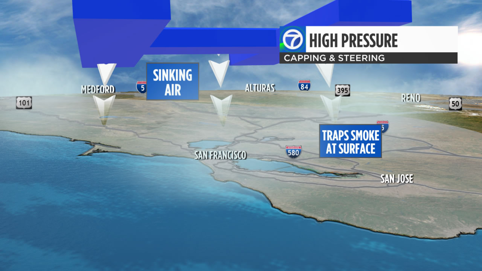 High pressure to our west keeps steering smoke from the Camp Fire across our neighborhoods. Sinking air within high pressure also puts a lid on atmosphere and concentrates all the smoke near the Earth's surface.