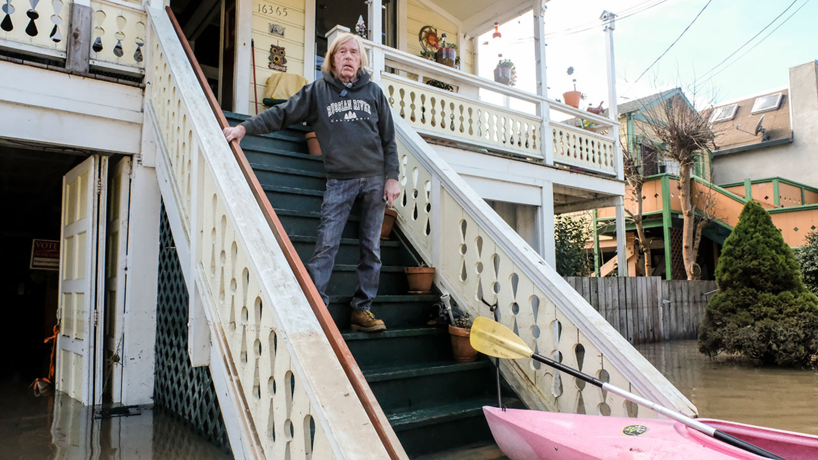 That's hell as in high water, block after block north of Main Street. It's a region of Guerneville where front porches now double as docks.