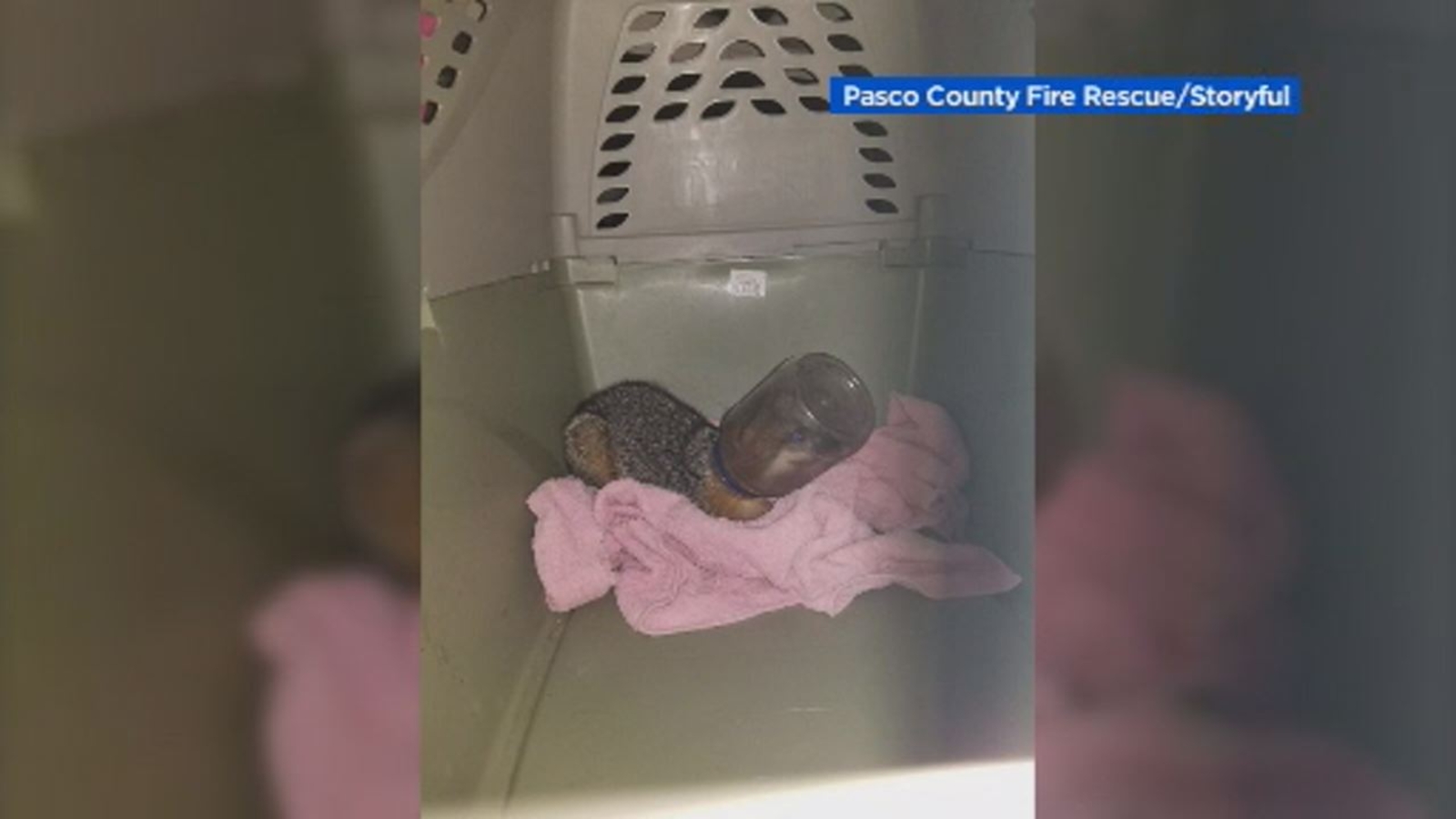 PASCO COUNTY, Florida (KGO) -- A little fox with a jar stuck on his head is finally free. Firefighters initially spotted the furball wandering behind a Florida fire station on June 12, but they couldn't catch him. Crews called a local animal rescue to help.