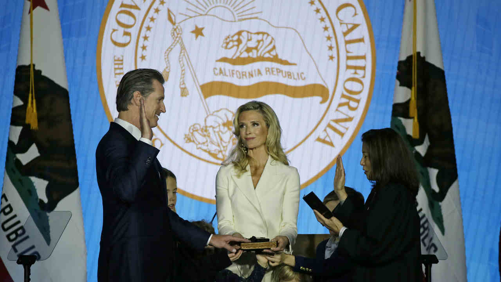 Newsom's swearing-in was briefly interrupted by a protester who screamed "I object!" just as the oath was being administered.
