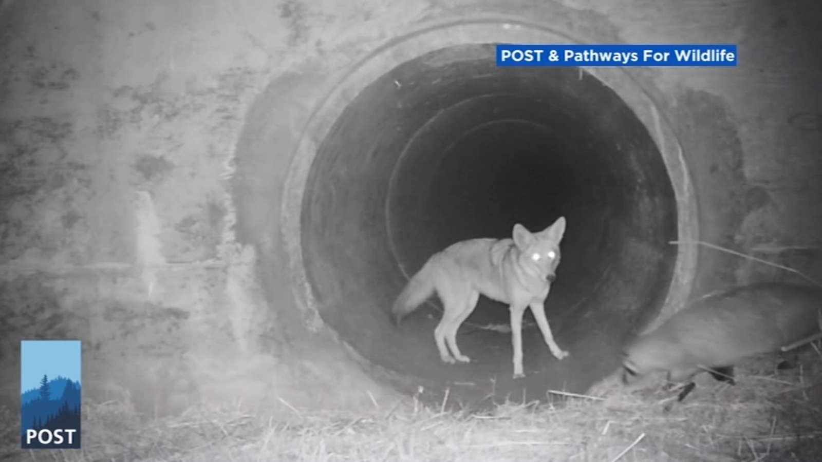A coyote and a badger, two unlikely friends out for a stroll in a protected pathway made specifically for wildlife.