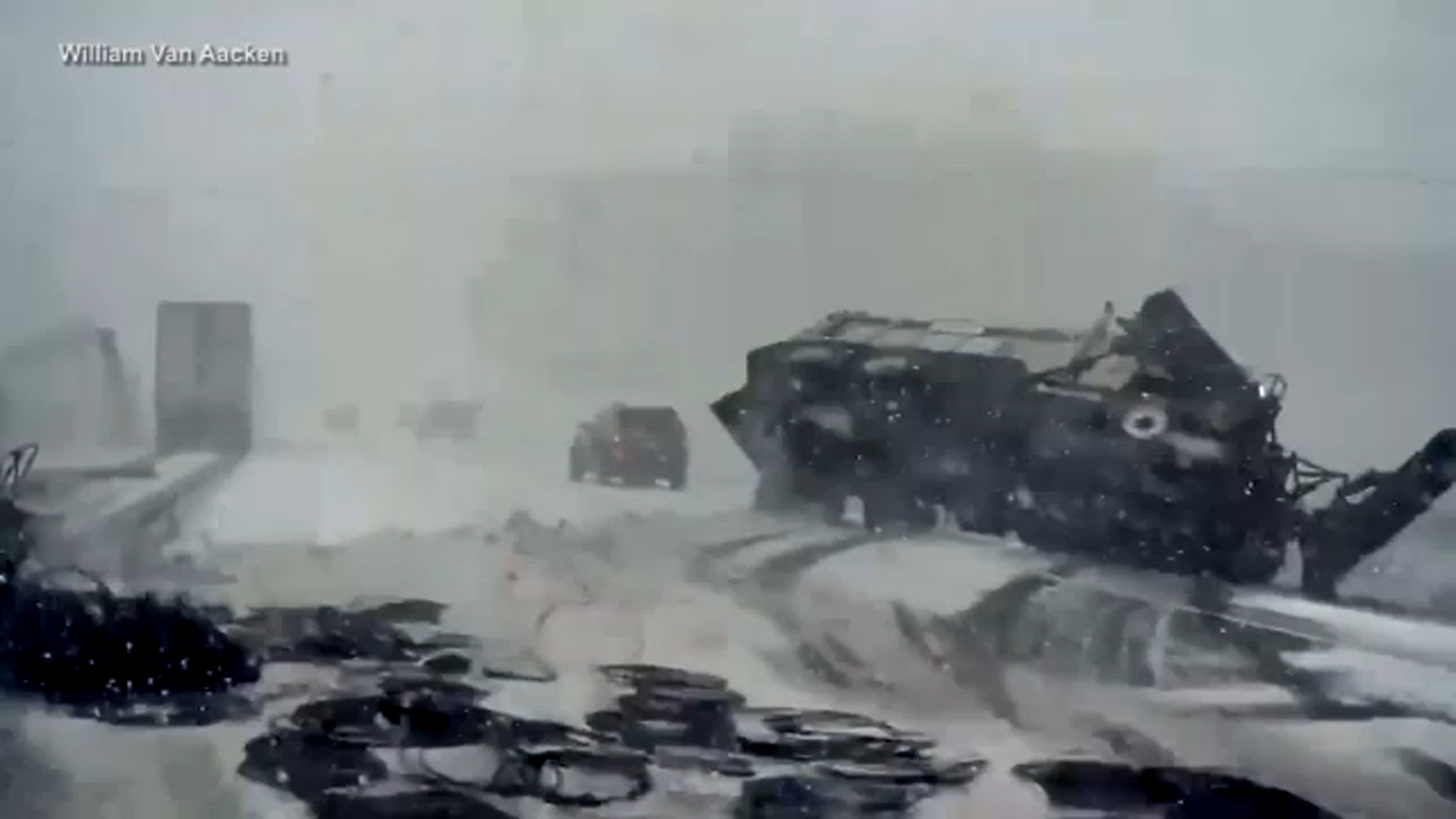 Dashcam video shows the moment a semi-truck hit a snowplow, causing it to overturn and roll into a ditch. The man who recorded it told ABC affiliate WISN-TV whiteout conditions appeared suddenly.
