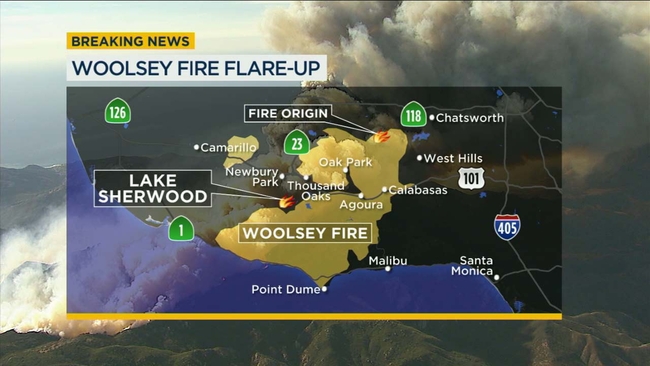 LAKE SHERWOOD -- Despite a stubborn flare-up of the Woolsey Fire near Lake Sherwood Tuesday, the containment of the massive blaze continued to rise.